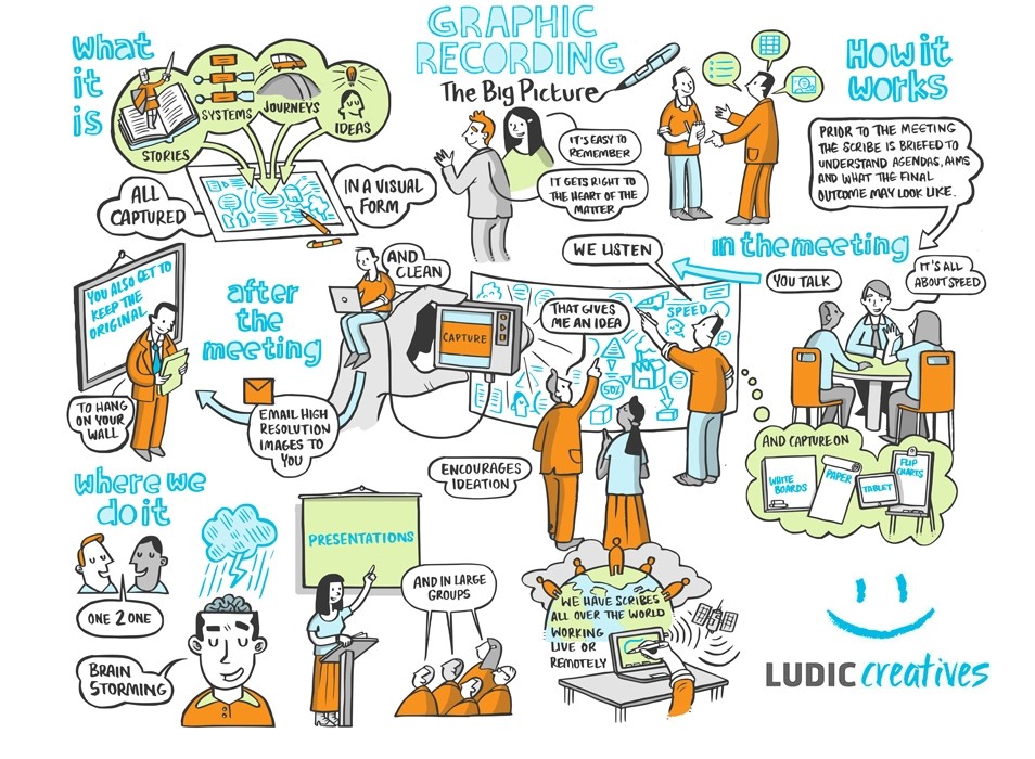 A design-thinking process is the red thread that leads you through a maze of ideas and decisions. One of the creative tools we use at Ludic in our design led approach is visual scribing. Its ability to synthesise, spark new ideas and create an equal space is invaluable when we are co-authoring, prototyping, building vision boards and finding the steps to move forward.