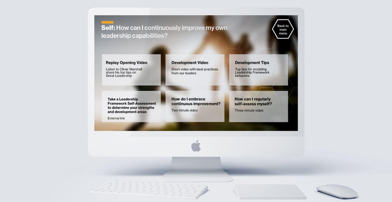 Using our interactive video platform, we constructed a series of richly designed interactive menus which hosted both pre-existing and newly created content. At the heart of the tool was an interactive flashcard game based around the 15 key behaviours that associates are required to demonstrate. Once each card or tile is clicked, rich multimedia resources are revealed such as animated videos, interviews with experts, top tips, and links to external learning videos.