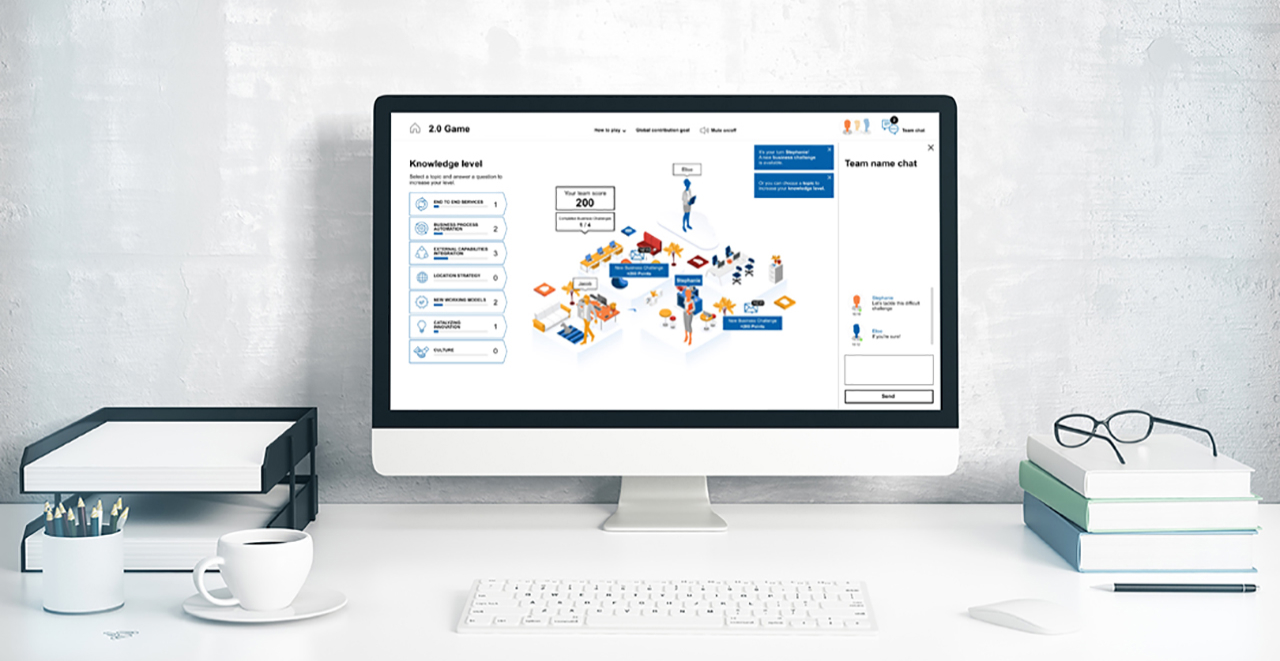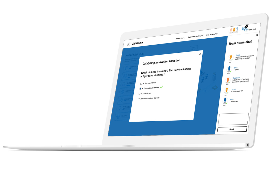 This game links globally situated colleagues in the pursuit of a collective goal. Players sign up and invite their colleagues to join them in teams. After viewing multi-media learning, they answer questions on business topics as diverse as location strategy, procurement and company culture, then apply that to business challenges. Each team contributes to a global total, allowing engagement that’s positive, collaborative and non-competitive.