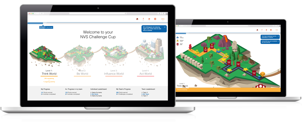 As the participants move through each level, the gameplay and tasks become more intense and complex. Individuals and teams progress in parallel, completing team challenges and individual activities each week. Supported by compelling visuals, illustrations, animations and videos, engaging, impactful content ultimately leads to better learning performance.