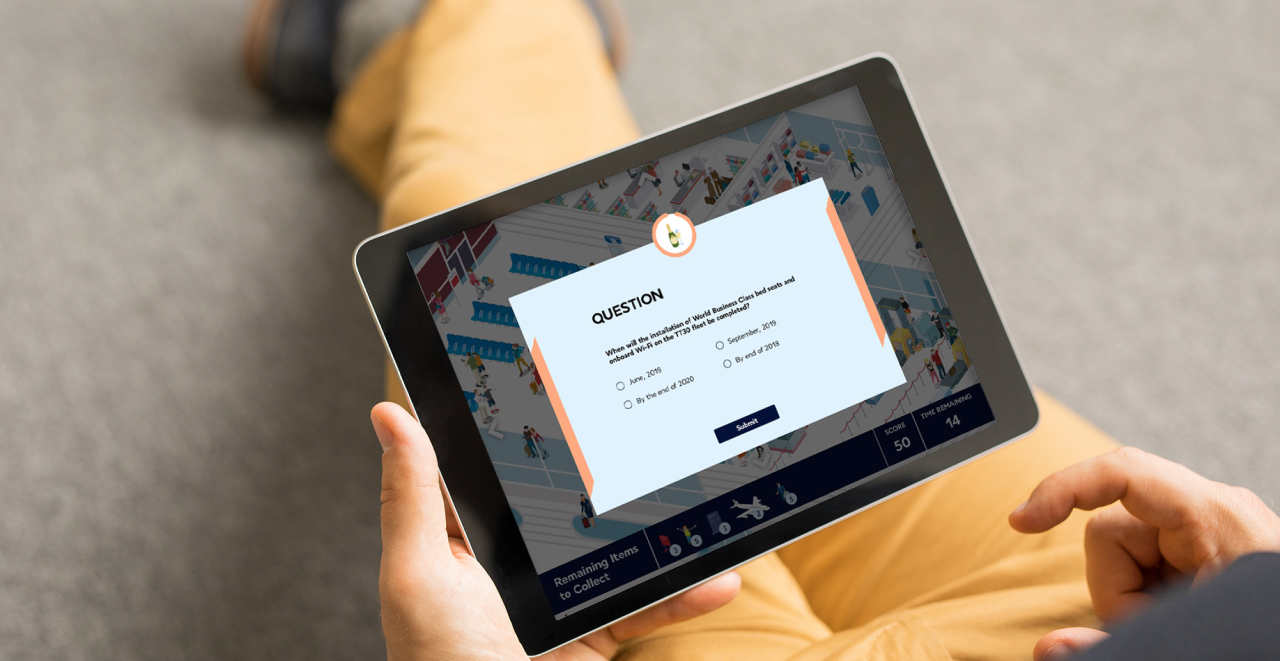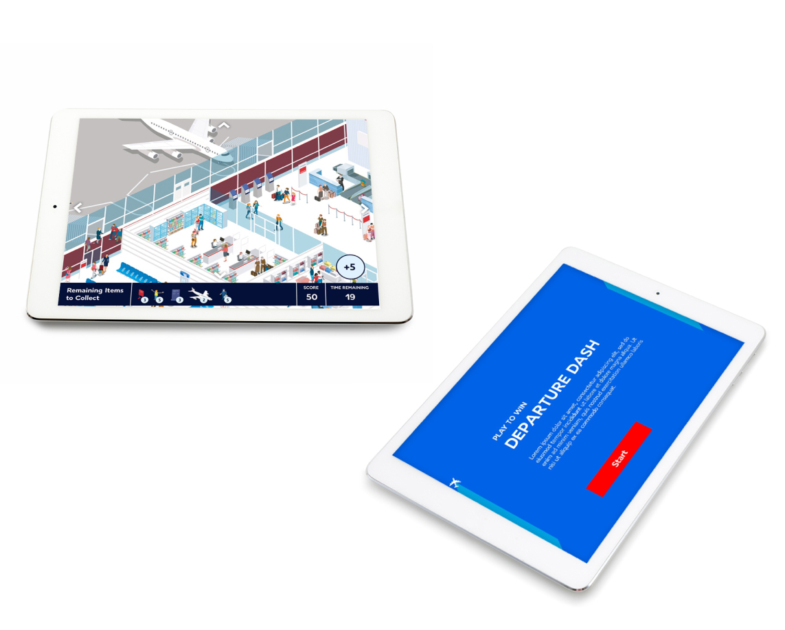 To engage people at exhibitions or shows, this major airline required a game that would not only engage people, but also teach them about their products and services. We created a fun graphic of an airport to explore where players have a limited time to spot items, tap on them and then answer related questions. Their times and scores are recorded on a global leaderboard, encouraging replay and more understanding of the client’s business.