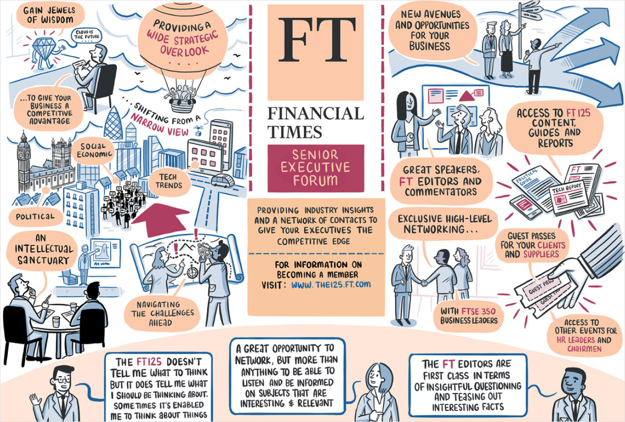 The brief was to create an image to be shared on LinkedIn that emphasised the benefits of becoming a member of the FT 125 Senior Executive Forum. The purpose was to drive engagement to their LinkedIn page in order to share the FT 125 story to a wider audience. Following an in-depth briefing call with the FT team, we worked from the studio on an iPad Pro to create a first draft image. This then went through a series of iterations to create the perfect big picture for their requirements. We collaborated closely to ensure their narrative was told in a clear, memorable and engaging way. The result was a great success with increased engagement on LinkedIn.